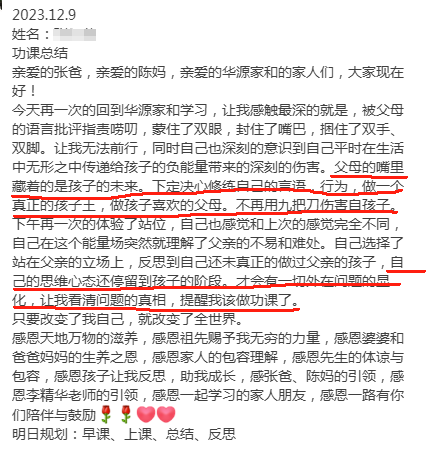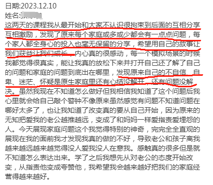 位985双学位博士后分享道:在学习之前,家里的什么事情都是我自一个人做,无怨无悔,自己以为这样做家庭就会越来越幸福,但是慢慢的就感觉到,自己这样付出,不仅与老婆的关系相处不了,与孩子的关系也是一团糟,通过这次的两天学习,让我看到了我家庭的问题,同时更重要的就是通过这两天的学习,让我找到了方法,怎么去引领家人的前进。
